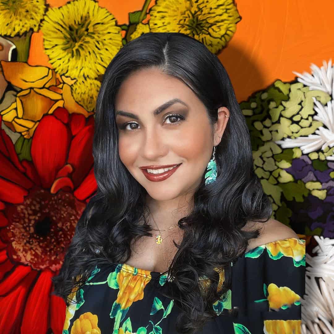 Photo of Ketsy Ruiz, a Latina woman with dark brown hair wearing a floral top and turquoise earrings in front of a background with a red circle
